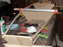 I used a butt joined scarf with a 3" piece overlapping on the inside rather than a fiberglass cloth strip. By the time I started, my epoxy was in transit, so I used Gorilla Glue (R) for those joints as well as the seat frames, sheer clamp scarfs, and sheer clamp attachments. The Gorilla glue worked great, and saved on the epoxy. It is not a "pure" stitch and glue since I used brass screws to attach the sheer clamps along with the glue. The sheer clamps themselves are ripped from 3 old door jambs salvaged from our remodeling project. Since they were clear pine, over 50 years old, I thought they should have a second life.