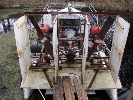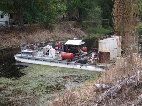 I got the original pontoon boat, 24 feet long, from a neighbor after he hit a concrete barrier, and ripped open the left pontoon. He gave it to me. After getting a professional canal cleaner quote of over $6,500, I decided to make my own. After adding two more pontoons, and a 318 Dodge v-8, I built the supporting frames and made the props from 3/16' steel creased in the center. It took me about 5 weeks to get them balanced to be used. It has hydraulic steering and steers with a 3 position electric switch.