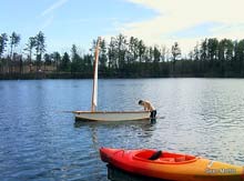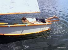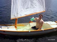 HI Chuck, Here is a quick pic (by John Kohnen) "Splash" of my Kayleigh design (by Tracy Obian) redesigned by myself and named "Marsh Hawk." I plan to do an article for Duckworks on the design, building and performance of this remarkable little cruiser. I have been totally consumed for 1 1/2 years building Marsh Hawk, you know how that all goes.