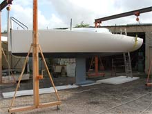 Here are a couple of pictures of hull number 0001 going out the door today. Started bolting on the keel this afternoon. Should be on the trailer and in the water by Monday.