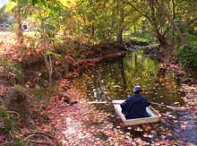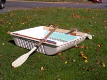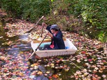 On the way to work one morning I saw that someone had discarded a Sears Xcargo car rooftop carrier and thought that the top half would make a nice hull. I paid the neighbors $2 to let me hide it under their porch just as the trash truck arrived. To make it into a boat required only installing pine gunwales to tie the rope oarlocks to, and the addition of some foam flotation, although the fiberglass it's made of barely floats naturally. For a seat, I throw a flotation cushion in the bottom. It is a bit more flexible than I'm used to, but it only weighs 17 pounds. It is about 4' X 3' X 1'. The following two images show it in a very restricted part of Four Mile Run, something I can do after work without driving ten miles in rush hour traffic to the river.