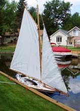 Here's a pic after she was finished and we did "sea trials" with her back in July (on an inland lake). We learned some things, made some changes to the clubfoot jib boom, built a new gaff with wider longer jaws, re-rigged the topping lift to be accessible from the winward side of the boom on either tack, moved the cleats for the slab (jiffy) reefing system so they are more accessible by a solo crew (me :), and moved the mainsheet hexaratchet forward a bit.