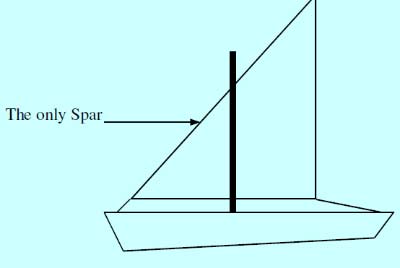 With this method the sail goes around forward of the mast. Most everything else is the same as the previous method. This method means the spar will have to be secured to the mast very close to the mast top. The reason for this is so the spar takes the wear of scraping the mast, rather than the sail. The line which moves the sail around forward of the mast does not come from the peak but the clew. It simply rotates the sail around before the mast from the clew rather than rotating it around aft of the mast from the peak.