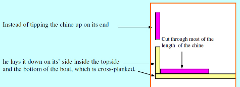 This is how he cuts it, not all the way along the chine. Glue is applied to the inside of the cut after it is put in place. One end will bend longer than the other, so the short end needs to be long enough.