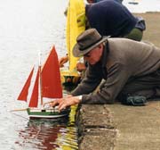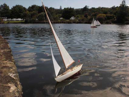I don’t even know where the little oyster smack shown in cheeky mood (above) is these days, perhaps with one of the two adult sons of the late Bob Walters which would be very fitting. To the very best of my knowledge it was or is, the only one in New Zealand. I need another boat like another mouth in my face but I still regret now and again as I think about the wee boat, that when Bob offered it to me I did not accept. `We must not look over our shoulder at regrets’ some wise man once said to which I would add, you’d end up with a painful stiff neck! I will always remember that Thursday morning gathering of the Ancient Mariners, a fleet of some seven or eight boats sailing into the wind, the tiny Maldon smack, Boadicea bringing up the rear. Suddenly the two larger boats came about and headed downwind for the lower region of the pond. Bob was quick to spot the move, turning the little smack, her mainsail extended outwards and picking up a strong breeze she was off like a scalded cat with the other boats in pursuit. Standing beside Bob with my camera poised, I was able to capture this photograph of a little model of a working sailboat storming back home ahead.