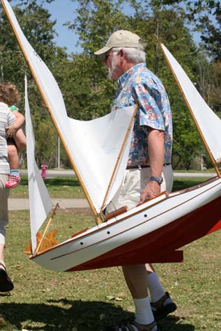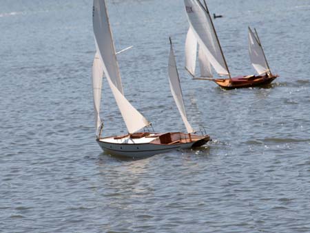 Bob Seiden can be credited with having introduced my `windling’ model sailing concept to America in the United States I’d say, the Kings Point Model Yacht Club in Florida of which he is Commodore and `Chief driving force among the snowbird sailing members having adopted it several months. What is windling ? Well it can be anything you want in the line of non-competitive or even vaguely race oriented. Sail around the lake over an agreed course as a fleet while you enjoy your `cruise’ and if you miss a buoy so what – look upwards, the sky is still there and nobody has stolen your trusers so what’s the big deal! There is no prize, and chat with your fellow skippers as you all walk together and follow the boats, or set a tight course (or no course at all and `sit and sail’ as the KPMYC group is seen doing, even take a break with the Solings parked in the shallows as the other picture shows.