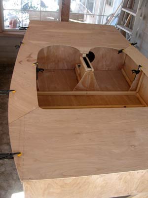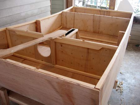 I wanted to give the boxy little boat some graceful curves, after all someone who has just built their first boat will want something that they can be proud of. I wanted to give extra cockpit space and a seat height that would comfortably fit my customers leg length. I aimed to put the crew weight out where it would do the most good, and achieved all of those goals with a cheeky sheerline that was down near the minimum allowed by the rules, and by putting “wings” on in the form of an extension of the deck line out over the sides forming wide seats that overhang the sides in a graceful curve from bow to stern.