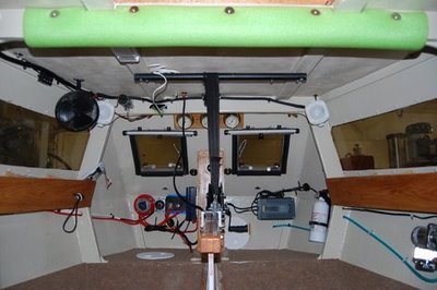 There's a 4hp diesel in the aft compartment which is used to charge two marine batteries which in turn power a 55 lb. thrust trolling motor, judiciously used. He also carries an air compressor, radio bank and a solar panel. Quite a lot in a 14' loa 6' beam cruiser.