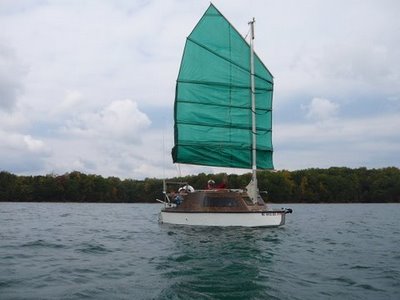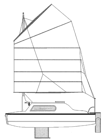 The Junk rig is made from polytarp and cost about $100. and can be reefed from the cabin. Bill finds the Jung rig far more friendly than any other rig he's used, including gaff and gunter. She ha a 246 pound drop keel and an aluminum kick up rudder.
