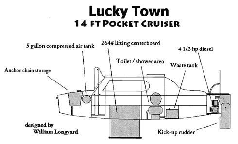 Dissatisfied with the available production boats for what he terms mini cruising, Bill Longyard decided to design and build his own, to "show what could be done with 14 feet". And show he did, and then some. His little Lucky Town design has sitting headroom for two and enough enough space for a six footer to stretch out comfortably. There is a flush toilet and holding tank and provision for a shower, though the shower's not yet implemented.