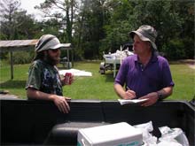 At the beach was a motley collection of small boat enthusiasts: The entire male side of the Moffitt clan: Bill, Paul (organizer of the OBX130), and Sean. Bill had brought his Michalak-designed Mikesboat, Ember's Watch, as well as his good friend, Chuck “the Duck” Leinweber, owner/operator of Duckworks Boating Supplies. Sean had brought his Michalak-designed Piccup Squared, Patox, while pirate-y looking Paul came with just a friend, Stuart Bartlett, who looked even more pirate-y with three-foot dreadlocks, a scruffy beard, and authentic pirate accent from his native home of Essex, England. Luckily for us, Paul and Stuart, having driven down from Philadelphia, PA, were to be 'free-boaters' rather than freebooters as they were going to hitch rides on any available craft.