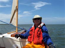 “Mac” McDevitt brought his blue, roto-molded Windrider 17 from Essex, NY and was eager to see how she performed against the yellow Windrider 17 Bob Grona had trailered up from Huntsville, TX. The participant list of the '10 OBX130 was rounded out with David Ware from Rockport, TX, with Merlin, his modified Bolger peapod, that, in addition to being stretched 1.5x or 2x, has a unique hard bimini for sun protection.