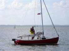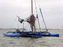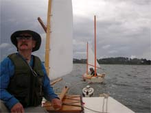 The passage to the gun club took a heavy toll. On Blue Laguna, our first scare came when the rudder grounded and popped out of its gudgeons. We were ripping along at over 8 mph when Mike noticed he didn't have any steerage, looked back, and sounded the alarm. I scrambled over the aft storage compartment and snagged the steering lines that kept the dangling rudder attached to our stern (Mike has the Laguna set up with centralized steering, running lines from the tiller around the aft cockpit to the deckbeam amidships.) As I struggled to pull the slipping, sliding, slithering, rudder assembly back into the boat, Mike steered by alternately backing the forward sail allowing it to fall off. It was a masterful bit of seamanship that proved to us the symmetrical sail rig of the Laguna was the true balancing force and the rudder was there to provide fine-tuning. After a few frustrating attempts, the pintles finally lined up with the gudgeons and I was able to re-ship the rudder. Mike had me tie a bit of small line over the tiller and under the gudgeon to keep the rudder in its place in the future.