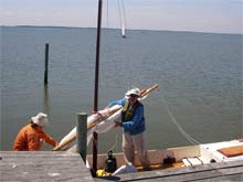 Bill and crew secure Ember's Watch at the Gun Club docks as Blue Laguna rows in. |