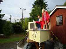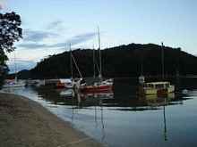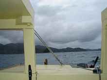 Eventually the Dad tacked back, but either the jib or swell resulted in very little progress to windward and we weren't getting anywhere, so we took the sails down and fired up the Yamaha 2hp outboard motor. Now we were going places! We motored through a channel between the two islands and then up between the islands and the mainland. We had to get around an exposed headland to our safe harbour. The Stevenson Weekender had already warned us it could get rough there – he called it the Mad Mile. It certainly was. With the outboard at maximum revs we only just managed to overtake a double kayak! However the Dad has learned a thing or two since he's been sailing our Philsboat and every time he saw a big wave coming he would meet it at a 20 degree angle so that we didn't pound too badly. A couple of breaking waves nearly came into the cabin, but luckily they broke harmlessly on the foredeck and ran off. Just as well because we really don't like salt water.