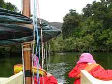 Soon we were on the water. Wheee! Conditions were good. My owner's Dad even put up a poytarp jib to try and get some more windward ability. It worked too, but then he figured that we could get to our destination faster if we went around the OUTSIDE of the Astrolabe Islands because there was more wind out there. We did a big tack to more than 5kms offshore. The Dad even joked that if we kept going we would reach Nelson, but, as Marahau started to retreat below the horizon we got scared.