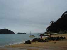 Observation Beach proved to be a bit of a challenge for the Dad. It shelves very steeply into deep water and the tidal rise and fall was about 3 metres. Earlier commentators at Torrent Bay suggested that his anchoring line lengths were excessive, but at Observation Beach he used the entire 50 metre length to keep the boat off the rocky shore. The ropes securing the boat had to be tied off near the tents in the foreground.