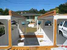 1. I extended the cabin front sloping forward 2 feet. This was to accommodate the porta-potti so it can be used in place. Also to hopefully foil the brunt of a green water wave over the bow if we venture out toward the Golden Gate. This also entailed lowering the thalwart beam to allow clearance to the head. A weaker configuration than the specifications. I did compensate in other forward structures. I boxed around the head and the cover serves as a step up onto the fore deck. There are wash boards fore and aft.
