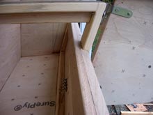 Now it was time to add framing to support the forward deck and the hatch areas. The plans do not show framing but with ¼ inch plywood it is necessary to provide support. After all, the crew will have to scramble over this deck to get on board from the beach, as well as in other situations where much weight and stress may be placed on these areas. Next I moved to the aft deck and added similar framing there, all made with fitted pieces of the cypress wood. In getting on or off the boat in a docked situation people most likely will step onto this deck, placing stress on the deck.
