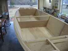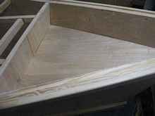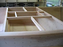 The first change from the plans that I wanted to make was a self-draining anchor well in the bow. I made a full height bulkhead twenty-four inches aft of the inner stem to separate the anchor well from the rest of the forward flotation chamber. This is where things began to slow down a lot in the build. All of the dimensions for this bulkhead had to be taken off the boat with a lot of angle gauge work to get the correct side and bottom angles.