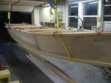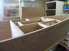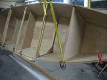 Shortly after we turned the hull over we had received information from Gordo Barcomb about problems with a great deal water in the cockpit of Laguna Uno after a sudden capsize. This made me rethink the type of seating I was planning for the Laguna Dos, as it was apparent that more flotation chambers seemed necessary to prevent this occurring and to help in righting her after a capsize. I decided to put in bench seating that doubled as flotation chambers in both fore and aft cockpits. That will be the next project to be completed before we can turn her and begin fiberglassing the bottom. Stay tuned for continuation and completion of Laguna Dos.