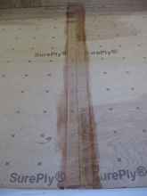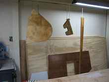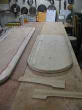 With this finished, I built my tiller and cut out all the parts for the two decks, the rudder and the leeboard. The Laguna tiller is a very simple one to make. It is sixty inches long and three and a half inches wide at the aft end, tapering to one and a half at the forward end. I made my tiller from 5/4 inch cypress. The rudder and leeboard are made from five layers of ¼ inch SurePy. The rudder has a five by five inch hole cut in the middle three layers which is then filled with lead, as per the plans. The outer two layers of the leeboard are two inches shorter on the aft end to cut down on the planing and sanding necessary when I shaped the foil.