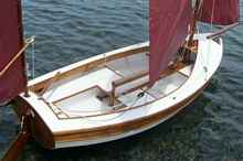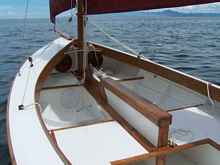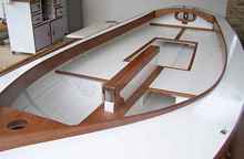 I wanted a leaner look for my boat so I extending the interior forward of the main mast. By doing this the coamings radius of curvature was dramatically decreased and I was able to use 15 mm solid hardwood instead of plywood for the coaming. Only three pieces of hardwood were used for the coaming. To accomplish this, I had to make a plywood pattern for each piece because the fit was extremely precise. When I had the plywood pattern shaped to my satisfaction, I used it as a template to finish cut the roughly sawn coaming with a router fitted with a top mounted bearing trim bit. I used a hardwood known locally as tanguile for the coaming, much of the trim and all the spars. It was used to make aircraft propellers during WW1, so I reasoned, “if it is strong enough for propellers, it is strong enough for my spars”. It is a species of mahogany that is very fibrous with only small tight knots. Several sources on the inter-net report tanguile swells and contracts more than other species of mahogany when exposed to humidity. Before using it I let it dry for almost two years and haven’t had any problems. To finish the interior I squared off the seats and used 15 mm Narra for trim.