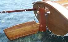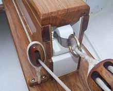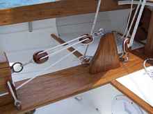 Narra is a very beautiful hardwood with a rich golden red color; it is highly figured and is called the Philippine national treasure. I was also concerned with the haul-up line and block chaffing against the bottom of the center case opening so I designed what my friends call a “shark’s fin”. It has eliminated any chaffing while greatly increasing center board haul-up lift leverage and in addition I now use it to anchor the main sail down- haul.