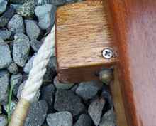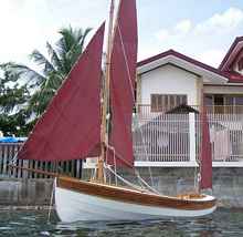 Besides knowing nothing about boat construction, I knew even less about rigging. Thanks to Duckworks much of that problem was solved. I purchased my sails, line and all the hardware I didn’t make from them. I also got some good useable advice from Chuck and Sandra was extremely helpful in delivering the materials. To ship by Fed Ex was too expensive and there was a high risk of theft if we shipped by snail mail, so she sent everything to my friend in San Francisco who was coming here for a visit. I built all the wooden blocks, cleats, fairleads and much of the hardware from stainless steel purchased locally. Making these small parts was probably the most enjoyable part of the project. I do things in an unorthodox manner and I continued that practice to the end of the project. I stropped all the blocks with polyester double braid by only using variations of an eye splice. I had no usable three strand rope and no experience with splicing so I was forced to do it my way – so far it seems to be working.