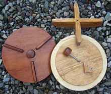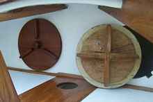 Since I know absolutely nothing about boat design, I built the hull as close to the plan specifications as I reasonably could, but when I finished the interior I decided it was safe to deviate. I felt there was no way I could make the forward hatch water tight as it was depicted in the plan, so I made two self sealing hatches. I first made a mock up to test the feasibility of my locking mechanism design and to be sure the hatch cover would be water tight. The three bars on each cover are used for turning it into locking position and the center knob is then screwed in to tighten the cover fitted with a rubber gasket against the bulkhead. To remove the cover the procedure is just reversed. The actual opening in each hole is an unobstructed 8.5 inches which I have found to be large enough to get my gear though.