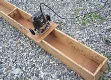 I needed the timber more refined so I took it to a small mill where they used a home made band saw with no guides to resaw it into thinner planks leaving a very uneven surface with deep saw marks. This problem forced me to build a jig to plane the hardwood using a one inch straight bit; I also used the same method to taper the bow sprit and boomkin.