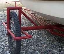 While I was building the boat my engineer was constructing our sea side house. The property has a six foot high sea wall and putting in a boat ramp would have made the sea wall ineffective so I built a man powered, wooden roller equipped boat trailer from steel water pipe. To launch the boat we get about six neighbors and they pull/push it about fifty meters to a nearby launching point. I give them about $4 for their labor so they can buy some tuba (coconut wine) and Pepsi for mix.
