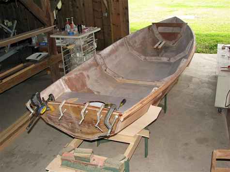 Instead of the timber frames that Lissa shows, you can see that I used plywood. I used the 6 oz diagonal bias tape on the seams and 12 oz diagonal bias fabric on the hull inside. This schedule is very similar to the Vagabond. I am using the System 3 resin and also QuikFair, both nice products. We are building the boat in an unheated barn and the cold temperatures slowed up the building process. I hope to finish before the temperatures get excessively hot.