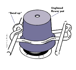 For materials, all you'll need is a clay pot of larger diameter than the burner and a length of wire. A coat hanger will do the job, but it quickly rusts. A better choice is brass brazing rod, 2mm (3/32") in diameter, available from a welder's supply house or some hardware stores. Refer to Figure 1 for directions on bending the wire. Note that the section marked, "Bend up," will exert a down force on the rim of the pot, keeping it in place, while allowing it to be easily removed when cool.