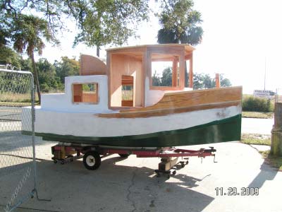 I’ve been busy building boats. More specifically I have been building the Bolger Micro Trawler I wrote about last time we corresponded. This from the guy who wrote the Duckworks 2008 article “Need for Speed”. I blame it on my wife because she’s the one who won’t hang her posterior over the side of the world famous “Chuggerboat”. That caused me to have to build a boat large enough to have indoor accommodations. Anyway, as I continue to try to finish her up I thought I’d send an update for your upcoming “March Reports”. Hopefully I can send a more complete and detailed article in the near future on the completed project. I haven’t come along much further than the attached November picture due to the unusually (relatively) cold weather here in Pensacola Florida this winter. I hope to finish her up this spring though and will report again at that time.