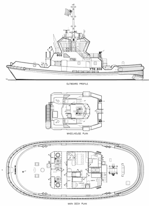 The tugs are configured as "day-boats" but also provide accommodations for a crew of up to six persons. One of the unique features of the layout is the complete separation of the accommodation deckhouse from the machinery casing, a configuration designed to both provide a reasonably dry access to the accommodation spaces in the notoriously damp northwest climate, as well as to provide a significant degree of noise attenuation in the crew spaces.