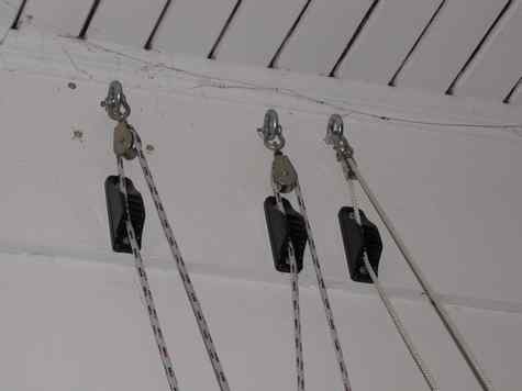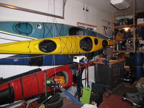 Following the article of Mario Stoltz, I would like to share with the Duckworks readers how I store our kayak fleet on the garage wall. I had to resolve my storage problem before stating the building of my Michalak AF4. The pictures are self-explanatory.