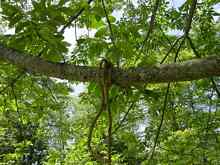 Ropes, tape, futility knife, a board for the scales yard, a bucket of water weighting 42 lbs, the canoe, writing stuff, and a convenient overhanging ash branch. |