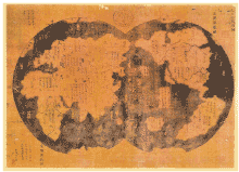 World map of the Ming Dynasty period showing North and South America, Bering Strait, Alaska, Central America, Australia, and the Antarctic south of Cape Horn. Other Chinese maps show the Straits of Magellan |