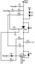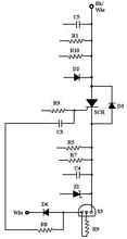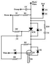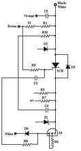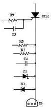 The big transistor with the heat sink hole on it is marked “MRC TYN 412”. This yielded nothing, so I took off the MRC, which is probably the manufacturer. Here we get something. It’s a SCR, or silicon controlled rectifier rated at 12 amps and 400 volts. They cost $1.04 each, which is about 20x what a transistor of the same size costs. A SCR is a lot like a transistor, except we call the base a gate. The difference is function is that it stays on once you turn it on, even if the gate current stops. It stays on until it has emptied the “pipe” leading to its anode. This is used in the power switches on high-end stationary power tools. Press the start button to start it and it stays on, but if the power fails, it turns itself off, so it won’t re-start unexpectedly when the power comes on.