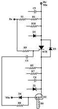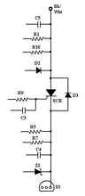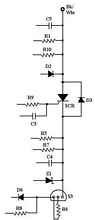 R6 connects between the two terminals, and the outer terminal connects also to the anode of D6 and R8.