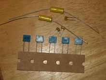 That last one is a resistor in a spot meant for a transistor. I guess this board was designed to serve in a number of different circuits, which undoubtedly kept production costs down. I got all ½ watt resistors because it seemed safer to stick with a 400 volt rating, and all of these happened to be ½ watt.