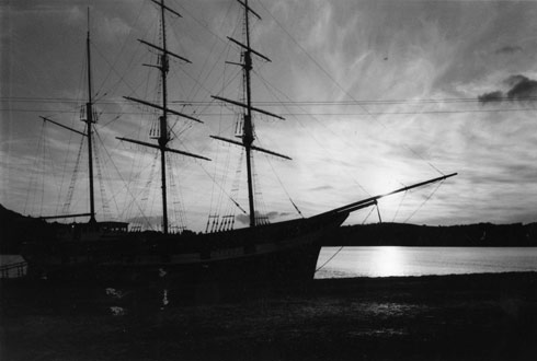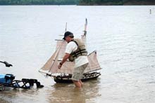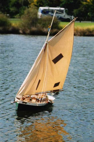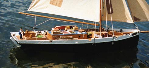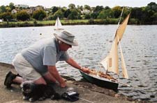 Kind of heavy and roughly painted it had the hallmarks of a `Warren build’ – stuck together with Blue Tack a bit of `any sort of’ glue; and bits of slivers of wood stuck here and there, a large spade rudder, old jib and mainsail and a not too straight bowsprit! to which was attached an old and yellowing sail. Old Warren had style alright! Well home she went and by the time we got there she had a name Blossom of Bequia for the shape of her hull and her beamy deck were rather like the fishing schooners and sloops that used to be built on the island of Bequia in the windward chain of Caribbean islands often referred to as the `Grenadines’. Nonetheless, since I had no room in my little work and boat shed she went straight in the back of the garage on top of a tall shelf – maybe with luck, someone would visit the garage and steal her. I never touched her for weeks then one weekend while filled with enthusiasm I started creating in an oven fired modeling clay a West Indian captain and a crewman for her (oh yes and a sleeping dog!), carved out her name for her stern, added a lifeboat mounted on the starboard rail and built specimens of `cargo’ after all she was going to be an island trader. With a servo fitted for steering, old Blossom was ready for cruising between the ‘islands’. Without a sail servo she was a boat that just lumbered along but in a reasonable and realistic in speed manner style and in time I learned to get her to come about into the wind, the knack being to keep her running then choose the moment carefully and whip the rudder over whereby she would `round’ and her big sail would come over and go out and she would head downwind. I started enjoying the occasional morning sails of the boat and when some clever smart ass walking with me wanted to know `what islands’ she cruised to I invented the mystical island of Ghobadi Bhaba five days sailing from Auckland where she picked up cargo in the form of huge bright yellow bananas! He seemed impressed and came back a few times with friends, took endless photographs of her and seemed to enjoy telling his friends about the `mystery’ island while they looked at me as if I was some sort of lunatic! One day a few weeks later when sailing Blossom, another chap walking the footpath said to me “isn’t she a bit low on the water mate?” to which with some `knowledge’ of ones own boat I said “No, she always sails low on the water! – quickly followed by “OH HELL! YOU’RE RIGHT …SHE’S SINKING!” and sink she did, right down to her deck in a matter of less than a minute, water even pouring over her high bulwarks but conveniently right near to the wall allowing the two of us to lay on our stomachs and retrieve her by grabbing bow and stern!
