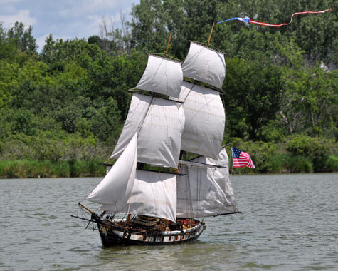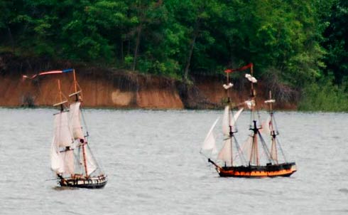 The original was one of two naval brigs of war (the other bring the Bainbridge) built specifically for the suppression of the slave trade. With fine lines she was considered over-canvassed and she became famous by being the only American warship to have a mutiny on board. Now have a look at Phillip’s grand little video of his model’s19th Cruise, and before scrolling down, have a further look at the selection of still photographs that I have chosen shown above.