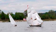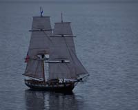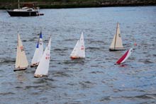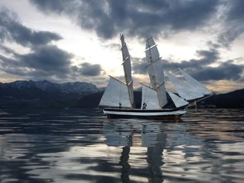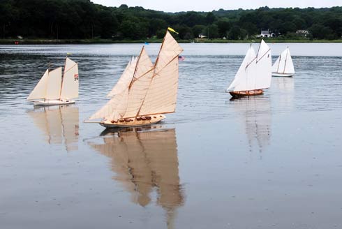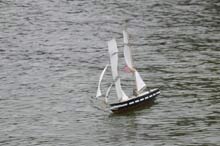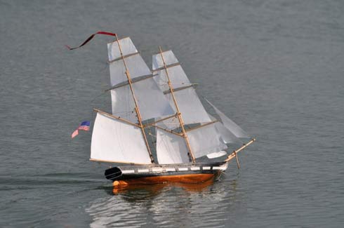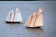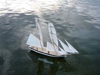 A really comprehensive excellent website for those interested in models of every kind including boats is www.rcgroups.com Free to join (you need to register and include your name and a selected password and then log on and log off each time, you can access a range of modelers and models via `threads’ that follow their building of models virtually step by step. It is on that website that I have `met’ and made contact, and now communicate with Dan, Lewandowski, Phillip Artweger and Brooks Martin, a few models of whom I featured in the November issue of this column. Phillip and I communicate regularly by email as well as on the Forum pages of this website. Judy Bonnano took this lovely photograph showing Westward nearest the camera, Harry Mote's new schooner further inwards and Andrew Charter’s Columbia and a fourth schooner extreme right