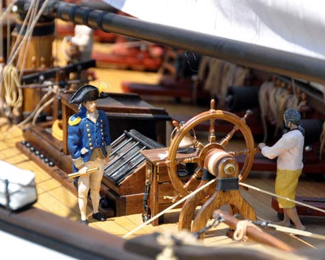 Wars of any kind are not pleasant events for loss of lives and resulting widespread destruction are always the products of such major confrontations, land wars, air bombardments and wars at sea it makes no difference, death and destruction follow. What does however usually result is an ongoing thirst for facts and accurate details under the heading of `history’. Books are written, films are created, documentaries are produced and often fine models are built to scale. Such is the case surrounding the US Navy’s 18 gun brig of war of 1797 Syren (changed to Siren in 1810) I won’t in this column go into the war history of this vessel for being a model sailboat column I prefer to hone in on the fine seven foot long RC model built by Dan Lewandowski of Minneapolis, Minnesota in the USA. Starting with a fibreglassed hull kit from Steel, Chapman and Hutchinson Ltd, Dan commenced building of the model in January 2007 and she was completed and launched in June that same year which speaks loudly for the dedicated enthusiasm and drive of the builder, and I’d have to say, the quality of content of the kit by S C and H who obviously `know what they are about !’ Dan’s input over the three years that followed in the way of innovations and details all arrived at by exhaustive research and painstaking skill and patience resulted in the model that the brig Syren the cracker of a 1:25 scale model is today. Dan Lewendowski is obviously a perfectionist in his model building and it is interesting to throw into the `detail pot’ at this stage, that nine of the eighteen guns fire live powder charges simulating a broadside, just one of a great many `innovations of realism’. The figures on board have been researched in the way they were attired and made and painted accordingly just two aspects of what I am talking about.