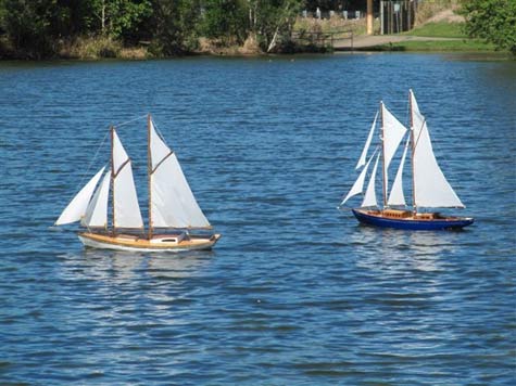 My good Australian mate, Rick Mayes is another avid schooner builder and ultra keen sailor living in Maroochydore on the Queensland coast of Australia Like the writer a windler and social sailor at heart a few months ago he sent me some photographs taken at Lake Shore adjacent tp the Sunshine Coast motorway when a group of his friends, wives included sat on the banks to watch a few of the boats present go through their paces while all enjoyed a pleasant sojourn of tea and Aussie biscuits under the Queensland sun. (Hey what’s wrong with kiwi biscuits?)