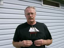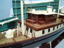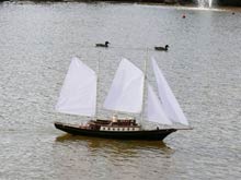 Right then – who won the principal award for the smallest RC schooner I hear you say! Well there were fewer entrants than freesail and the winner of the smallest RC schooner on Planet Earth was Hans Berger of Plainville, Connecticut fpr his topsail schooner with 3 channel RC Gypsy II with a deck measurement of 3.905 inches. Mike deLesseps of Maine in the US. For his second entry schooner Suzanne took the runner award. The boat was well thought out, a good looker and quite enchanting, I loved the photograph he took of it in the shallows with his little tug Brutus.
