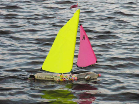 There are model sailboat fans who really enjoy building and then sailing bottle boats – that is boats with hulls made of once full now emptied bottles. In the UK they are even raced competitively and many are colourful and have humorous paint jobs and `hull’ designs. Andy Trewin who has built other bottle boats before has sent me a photograph of his latest, Toot Sweet shown above. Whether the performance is also `toot sweet’ we will never know. I’ve been thinking…were bricks able to float…well there would probably be a class for `brick boat’ racing! Seriously, bottle boats generally sail very well and they make up a popular racing class in UK. Read Chris Jackson’s article on the 2019 Bottle Boat Championship in the January 2011 issue of Marine Modelling International.’ -30- ![]() Click Here for a List of Articles and Columns by Mark Steele
