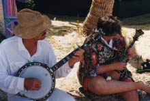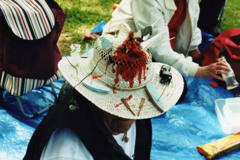 (above) Ron Rule in self-festooned hat swore that a would-be axe killer among the group had tried to cut his skull in half!